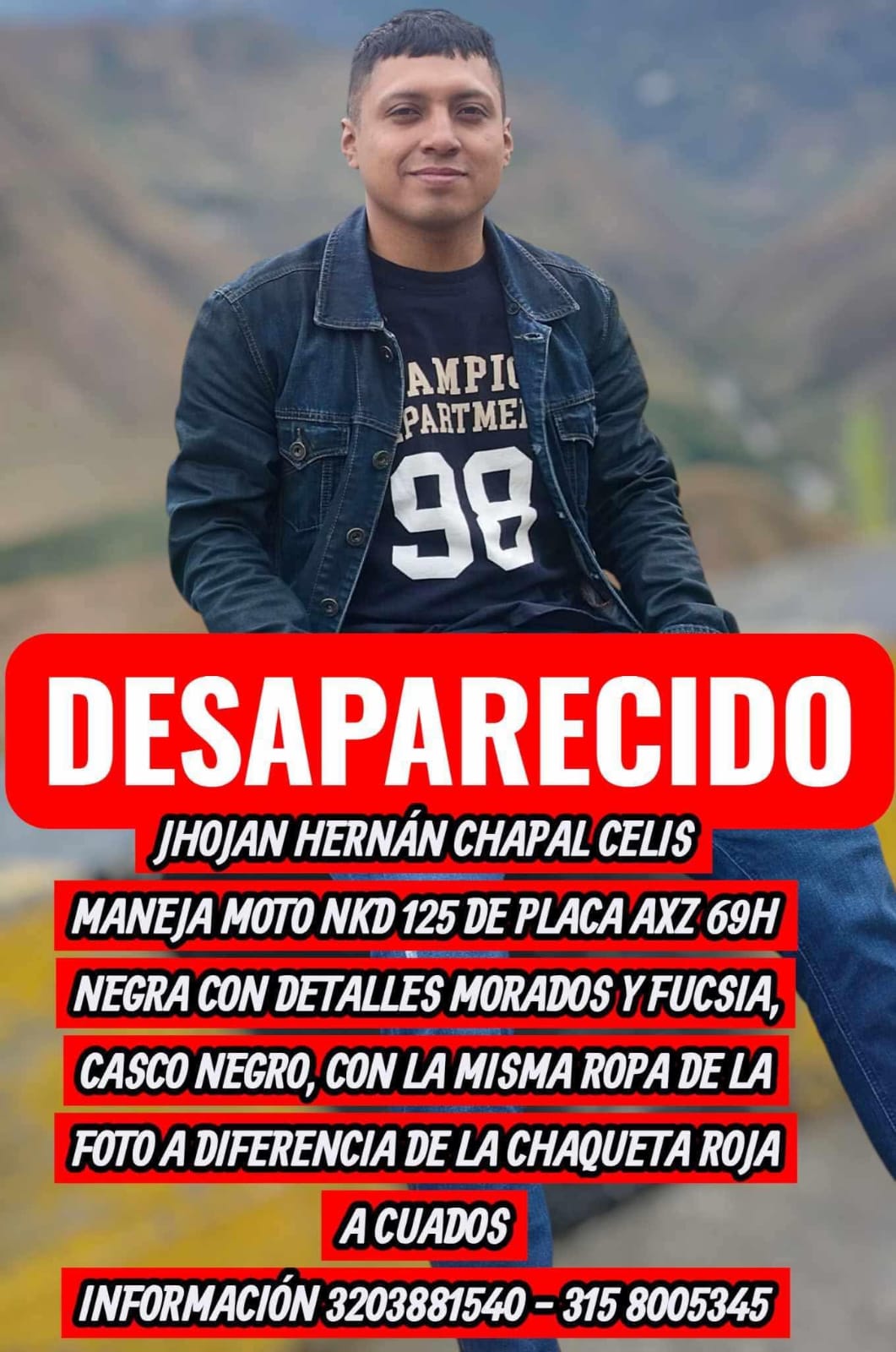 Se ha emitido una llamada urgente a la comunidad para ayudar en busca de Jhojan Hernán Chapal Celispresunto desaparecido desde ayer. Según la información compartida
