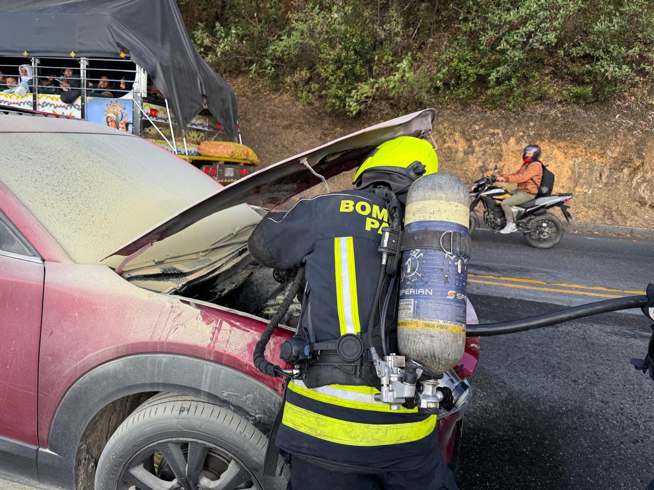 La emergencia se registró alrededor de las 5:35 de la tarde en la carretera Pan -American, en Daza, debido al incendio de un vehículo privado.