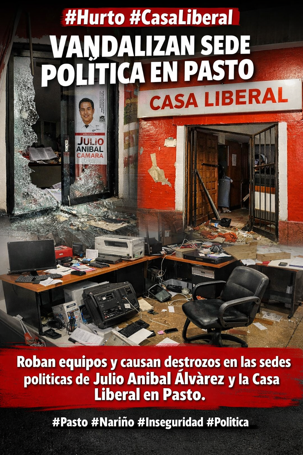 En un hecho que genera preocupación en el ámbito político regional, la sede de campaña del candidato a la Cámara por Nariño, Julio Aníbal Álvarez,